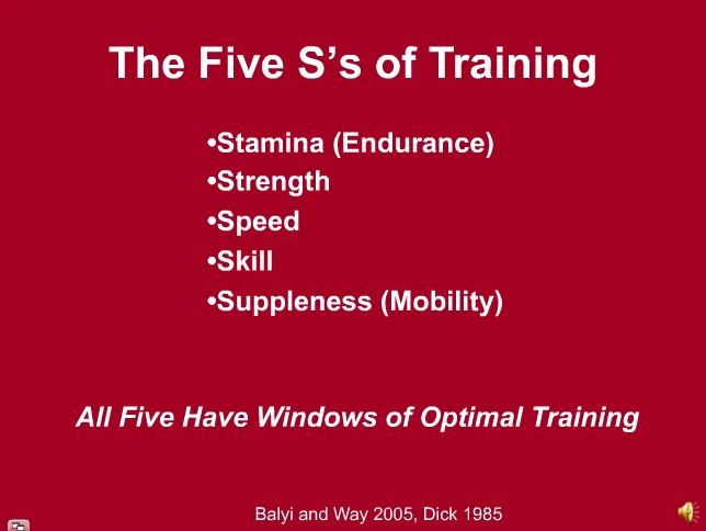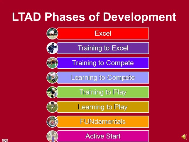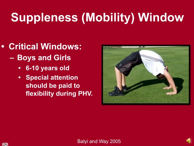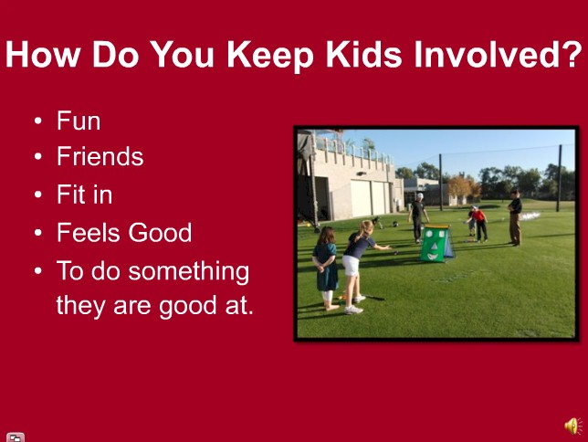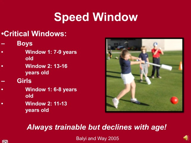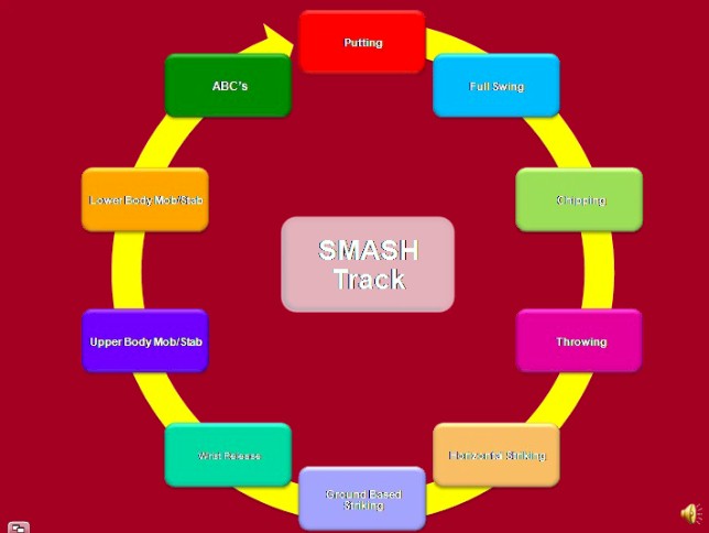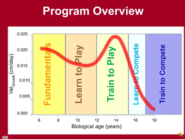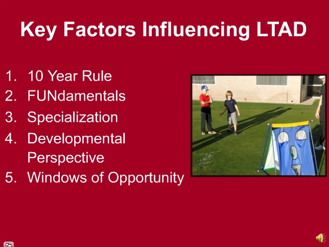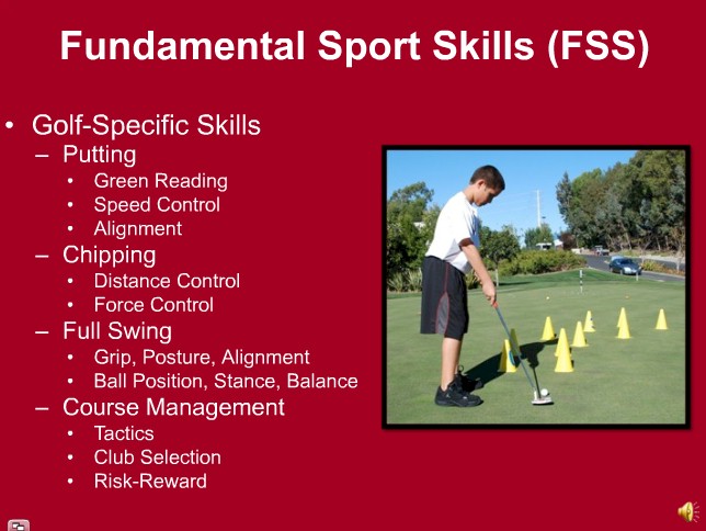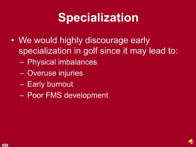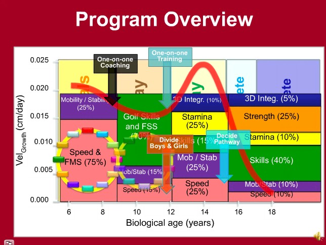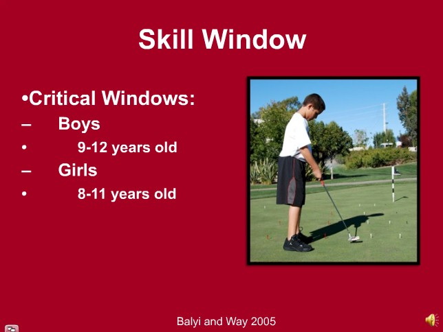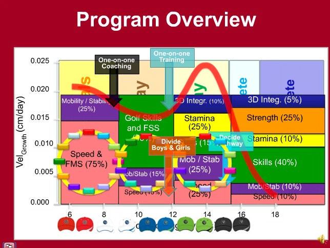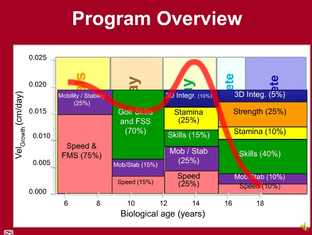Presentation Transcript: TPI’s Junior Golf Parent Support Workshop: TPI’s Junior Golf Parent Support Workshop Titleist Performance Institute: Titleist Performance Institute Dr. Greg Rose Special Thanks: Special Thanks Our Junior Advisory Team Denis McDade Dr. Ernst Zwick Istvan Balyi Dr. Liam Hennessey Brian Grasso Henry Brunton Simon Webb Al Vermeil David Donatucci Randy Myers Dr. Tom House Pia Nilsson Lynn Marriott Tadhg Harrington Brian Knight Long Term Athletic Development: Long Term Athletic Development The LTAD approach focuses on having kids perform age-appropriate skill acquisition drills to maximize their athletic potential. It progressively gets more complicated and more specialized as the athlete develops and reaches the next level of development. Key Factors Influencing LTAD: Key Factors Influencing LTAD 10 Year Rule FUNdamentals Specialization Developmental Perspective Windows of Opportunity 10 Year Rule: 10 Year Rule Tiger Woods 17 years Bobby Fischer 9 years Wolfgang Mozart 18 years How Do You Keep Kids Involved?: How Do You Keep Kids Involved? Fun Friends Fit in Feels Good To do something they are good at. FUNdamentals FirstStages of Developing a Golfer: FUNdamentals FirstStages of Developing a Golfer Fundamental Movement Skills (FMS): Fundamental Movement Skills (FMS) Locomotive Skills Run, Jump, Dodge, Skip Stability Skills (ABC’s of Athleticism) Agility, Balance, Coordination, Speed Fundamental Movement Skills (FMS): Fundamental Movement Skills (FMS) Manipulative / Object Control Skills Throw, Kick, Strike, Catch, Dribble Awareness Space awareness, kinesthetic awareness, rules Reasons for Poor FMS: Reasons for Poor FMS Limited exposure during development phase No access to facilities, opportunities, or programs Modern inactive lifestyles Little or no play Ill-informed coaches Overzealous coach Poor coaching style for child Overemphasize competition and winning too early Parents – ill-informed Family influences Fundamental Sport Skills (FSS): Fundamental Sport Skills (FSS) Golf-Specific Skills Putting Green Reading Speed Control Alignment Chipping Distance Control Force Control Full Swing Grip, Posture, Alignment Ball Position, Stance, Balance Course Management Tactics Club Selection Risk-Reward Fundamental Sport Skills: Fundamental Sport Skills Sport Specific Skills Advanced Striking Baseball Batting Cricket Batting Field Hockey Slap Shot Stick Dribbling Advanced Throwing Pitching Football Throwing Javelin, Discus, Shot, Hammer Basketball Free Throws Lacrosse Wrist Release Education Table Tennis Racquetball, Squash Frisbee Toss Physical Literacy: Physical Literacy Should have both before onset of growth spurt. From Dr. Istvan Balyi’s LTAD Resource Papers - Canada Specialization: Specialization We would highly discourage early specialization in golf since it may lead to: Physical imbalances Overuse injuries Early burnout Poor FMS development Developmental Age: Developmental Age Chronological Age = Number of years and days that have elapsed since birth. Developmental Age = degree of physical, mental, cognitive and emotional maturity. LTAD Phases of Development: LTAD Phases of Development Hat Classification System: Hat Classification System TPI Hat Classification System: TPI Hat Classification System Early Developmental Levels Intermediate Levels Advanced Levels Windows of Trainability: Windows of Trainability Accelerated Adaptation refers to “critical” or “sensitive periods” in a child’s development that they respond faster to a training stimulus. Due to many factors: Hormonal Influences Strength Development Nervous System Development Muscle Fiber Type Defferentiation From Dr. Istvan Balyi’s LTAD Resource Papers - Canada The Five S’s of Training: The Five S’s of Training Stamina (Endurance) Strength Speed Skill Suppleness (Mobility) Balyi and Way 2005, Dick 1985 All Five Have Windows of Optimal Training Speed Window: Speed Window Critical Windows: Boys Window 1: 7-9 years old Window 2: 13-16 years old Girls Window 1: 6-8 years old Window 2: 11-13 years old Balyi and Way 2005 Always trainable but declines with age! Strength Window: Strength Window Critical Windows: Boys 12-18 months after PHV Girls Immediately after PHV or At onset of menarche Balyi and Way 2005 Stamina (Endurance) Window: Stamina (Endurance) Window Critical Window: Boys and Girls Occurs at or around the onset of PHV. Aerobic capacity is recommended before athletes reach PHV. Aerobic power should be introduced progressively after growth rate decelerates Balyi and Way 2005 Skill Window: Skill Window Critical Windows: Boys 9-12 years old Girls 8-11 years old Balyi and Way 2005 Suppleness (Mobility) Window: Suppleness (Mobility) Window Critical Windows: Boys and Girls 6-10 years old Special attention should be paid to flexibility during PHV. Balyi and Way 2005 Growth Velocity for Boys: Growth Velocity for Boys From Dr. Ernst Zwick – www.growmetry.com FUNdamentals Cyclone: FUNdamentals Cyclone Agility Balance Striking Throwing Catching Kicking Jumping Locomotion Visualization / Awareness Rotation Push/Pull Core Strength Warm-Up Twelve Stations The Golf SMASH Track: The Golf SMASH Track Program Overview: Train to Compete Learn to Compete Train to Play Learn to Play Fundamentals Skills (40%) 3D Integ. (5%) Mob/Stab (10%) Stamina (10%) Speed (10%) Skills (15%) 3D Integr. (10%) Mob / Stab (25%) Stamina (25%) Speed (25%) Mob/Stab (15%) Speed (15%) Golf Skills and FSS (70%) Mobility / Stability (25%) Speed & FMS (75%) Program Overview 0.025 0.020 0.015 0.010 0.005 0.000 6 8 10 12 14 16 18 Biological age (years) VelGrowth (cm/day) Strength (25%) One-on-one Coaching One-on-one Training Decide Pathway Divide Boys & Girls